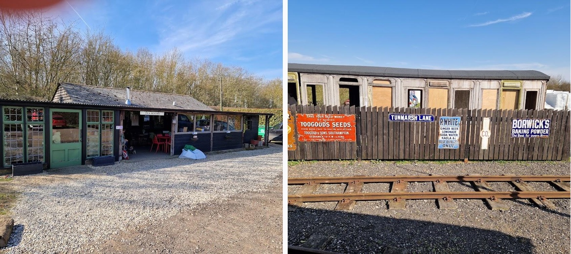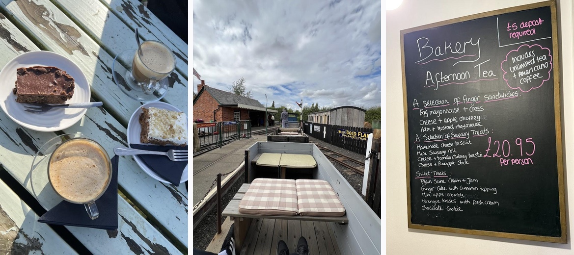We only stopped for coffee on our walk but plenty of customers tucking into breakfast. Seating inside, under cover outside and outside benches. An intriguing railway the other side of the hedge.